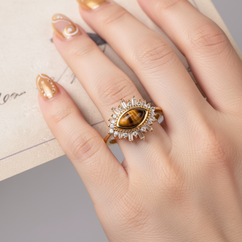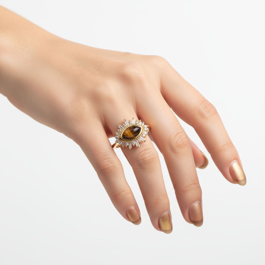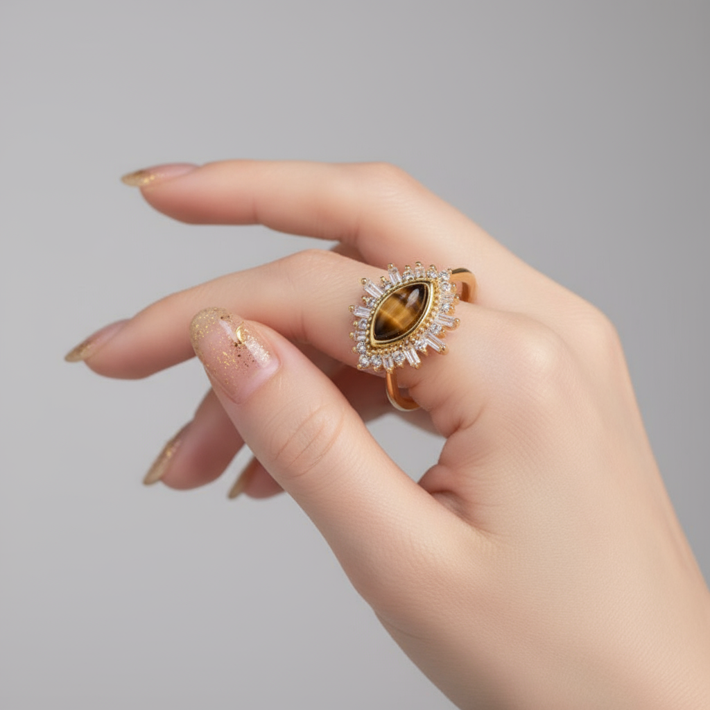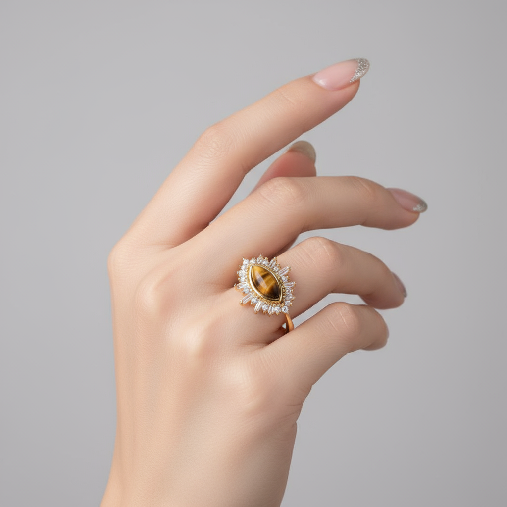 Make a captivating statement with this stunning Tiger Eye Gold Plated 925 Silver Ring. The centrepiece features a natural, polished Oval Tiger Eye stone, known for its mesmerizing chatoyancy (cat’s eye effect) and protective symbolism. The stone is framed by a radiant halo of round and baguette-cut Zirconia (CZ) stones, creating a brilliant sunburst or Evil Eye motif. Crafted from high-quality 925 Sterling Silver and finished with 18K Gold plating, this piece combines bohemian charm with vintage luxury. It’s the perfect unique statement ring for daily wear or spiritual accessorizing.
