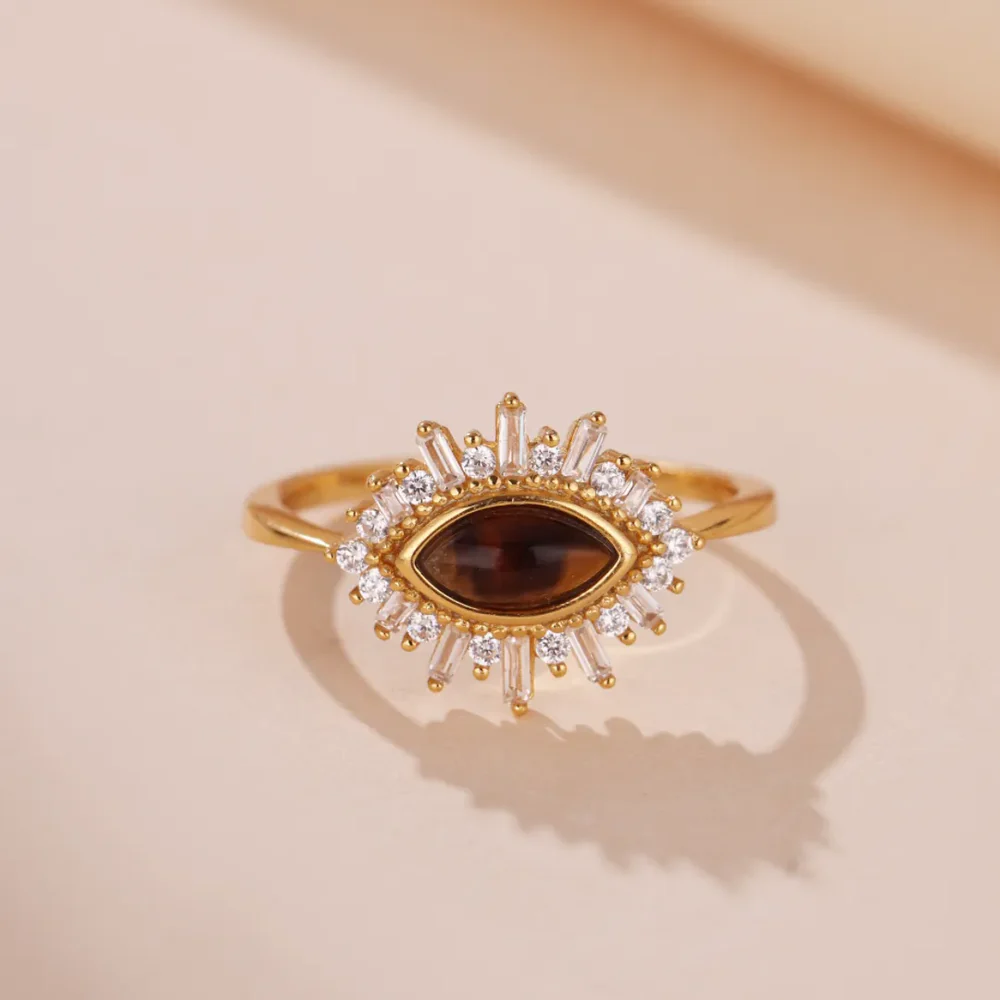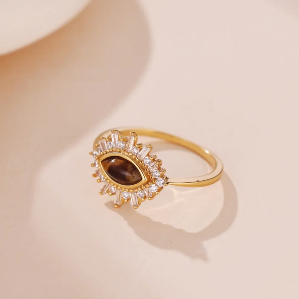 + Free ShippingChic Tiger Eye Evil Eye ring! This unique piece features a natural oval Tiger Eye stone framed by a CZ sunburst, all set on 18K Gold Plated 925 Silver. Dainty, meaningful, and luxurious.