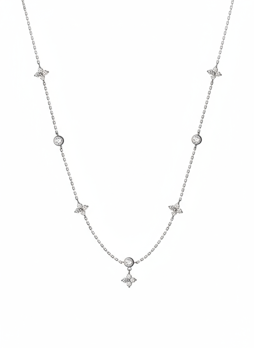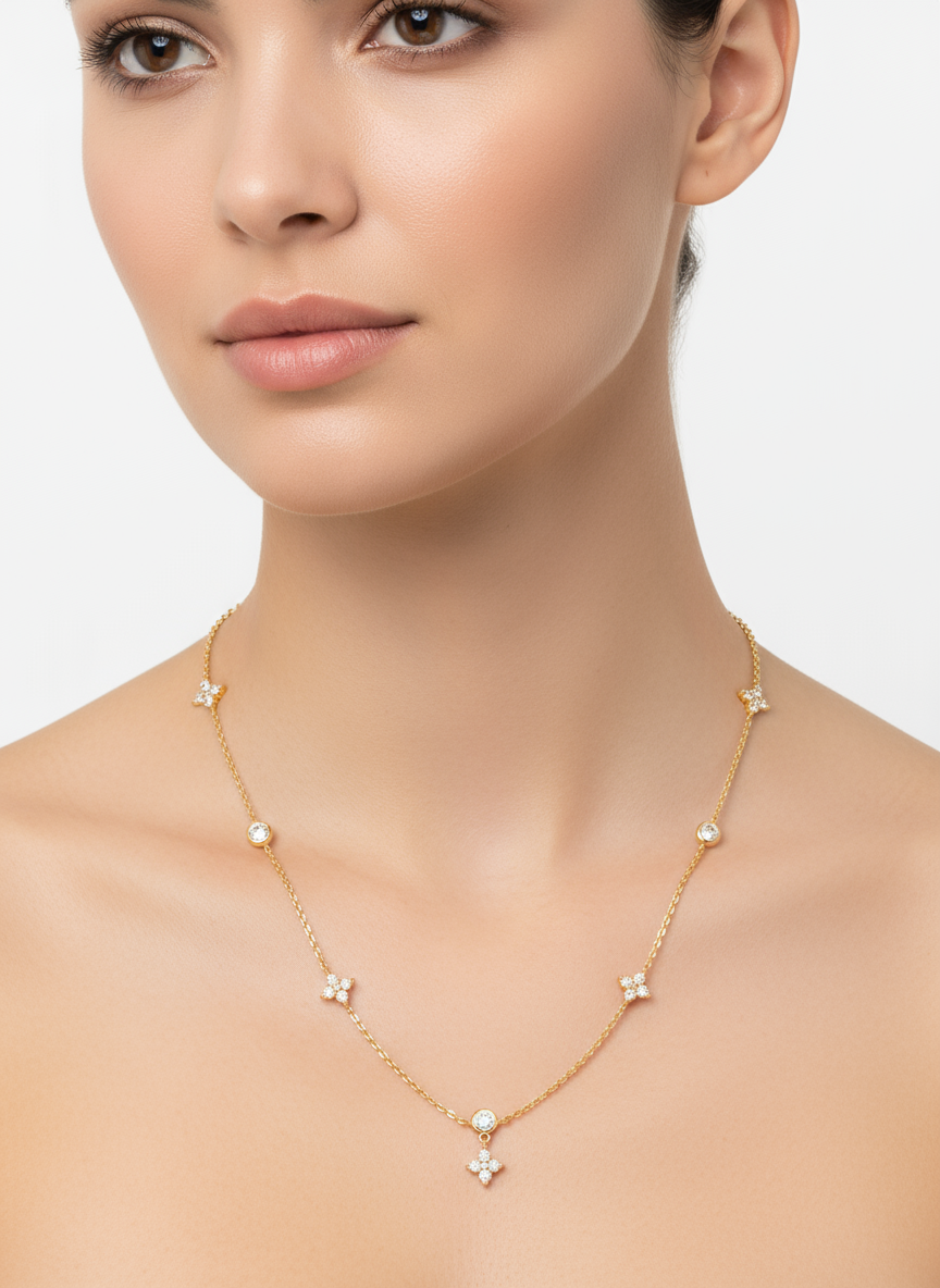 Elevate your style with this exquisite and delicate station Necklace. Crafted from high-quality 925 Sterling Silver and finished with a durable, rich Gold Plating or Silver, this piece offers the luxurious look of fine gold jewelry. The Necklace features a dainty chain adorned with alternating stations: sparkling round Cubic Zirconia stones (the highest grade CZ for maximum brilliance) and dangling flower charms set with shimmering micro-paved CZ petals. This unique design catches the light beautifully and makes a delightful statement. It’s perfect for daily wear, gifting, or adding to a stack of bangles.
