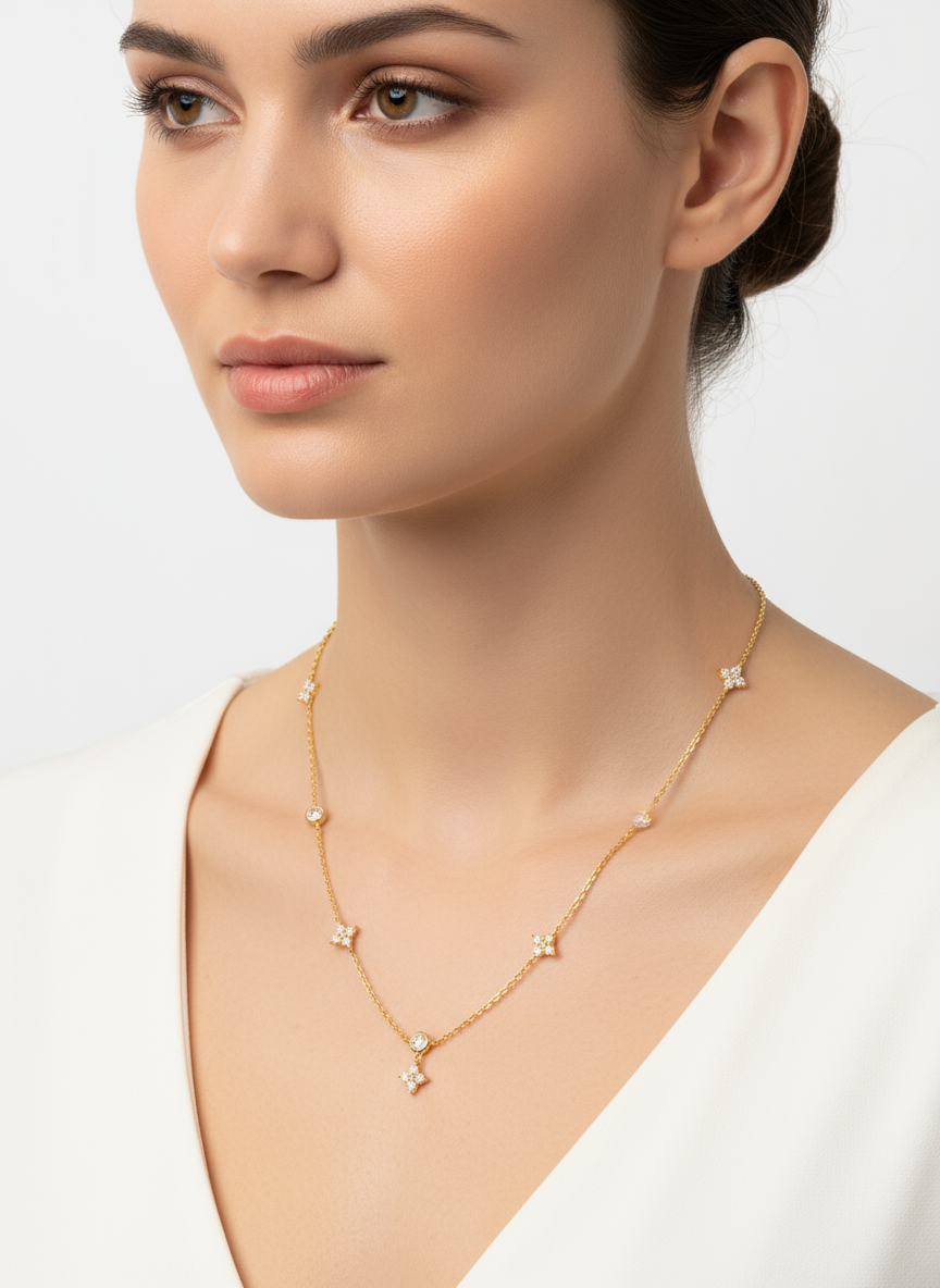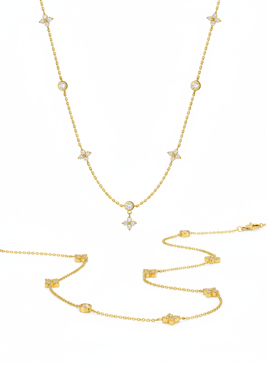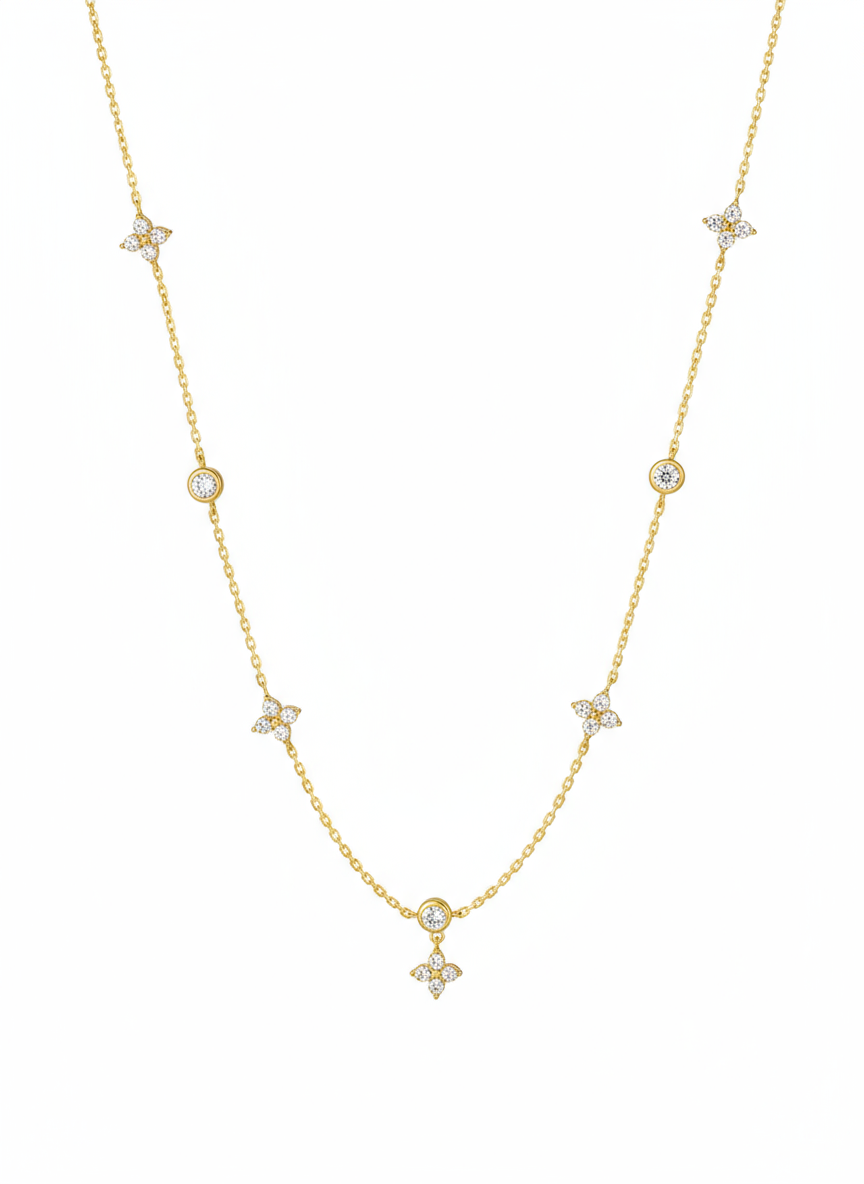 + Free ShippingAn enchanting and dangling station Necklace featuring delicate CZ flower charms and shimmering round Cubic Zirconia stones. Crafted from Gold Plated 925 Sterling Silver, this piece adds a rich, luxurious sparkle perfect for layering or as a charming standalone accessory.