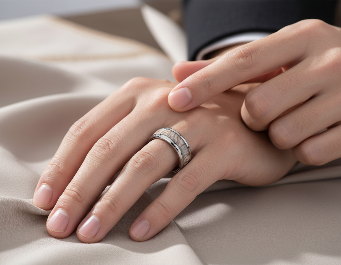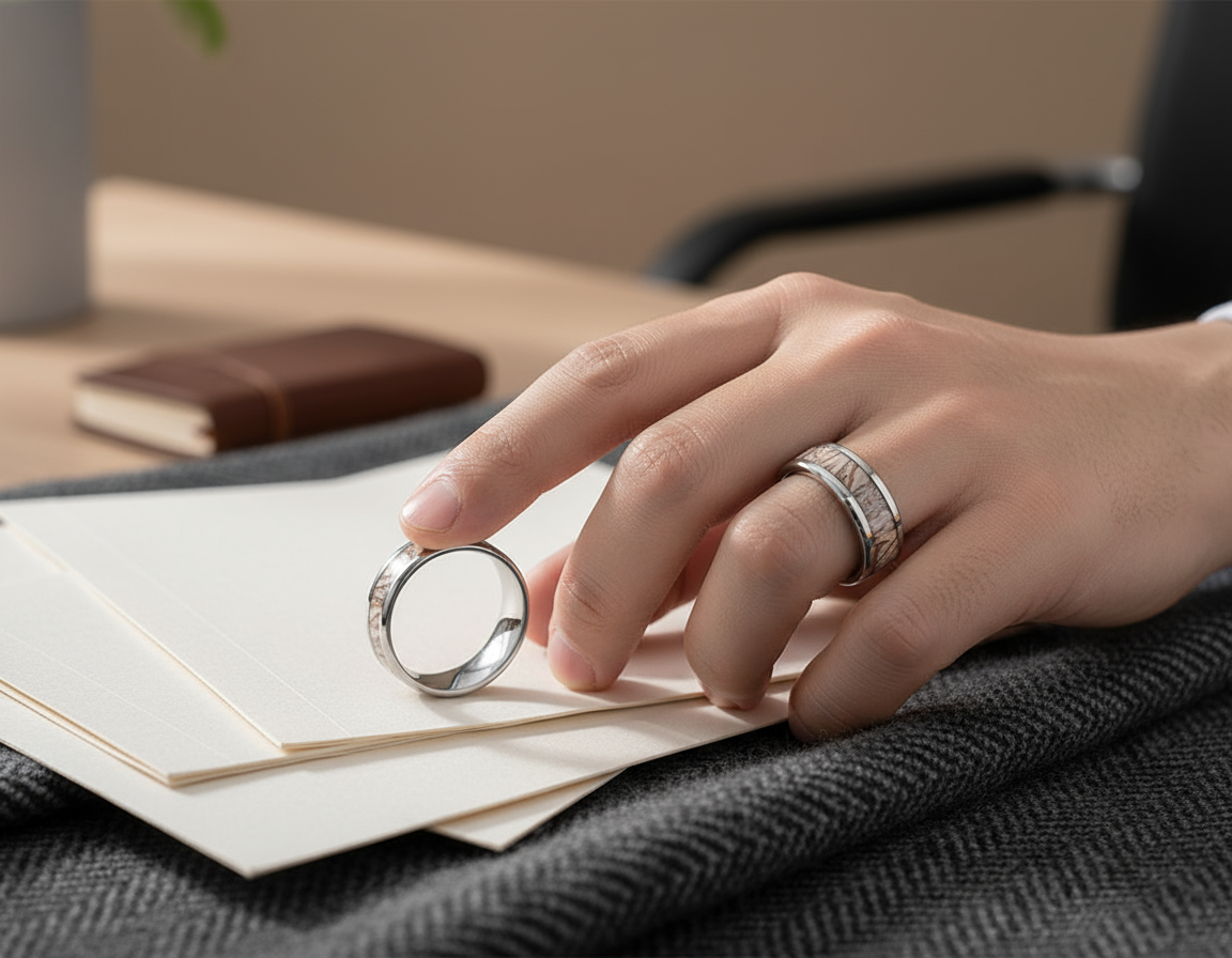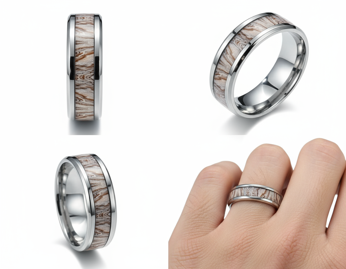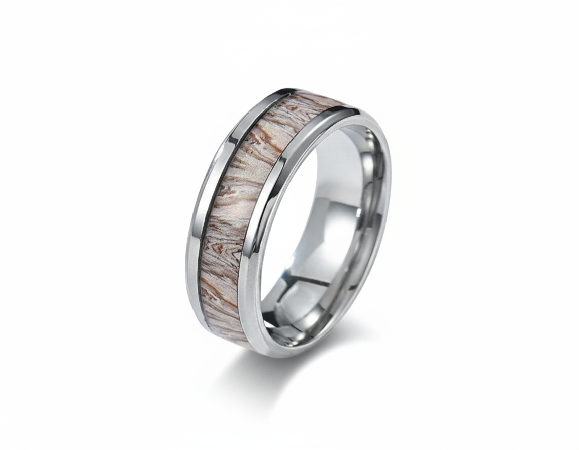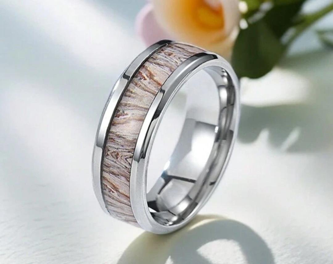 The true allure of this piece lies in its central inlay of natural wood. Each inlay is unique, featuring its own delicate grain patterns and warm, earthy tones, reminiscent of a peaceful forest grove. This individual character ensures that your ring is truly one-of-a-kind, a small piece of nature’s art on your hand. The contrasting textures of the sleek steel and the organic wood create a harmonious and captivating aesthetic. Perfect for those who appreciate natural beauty, modern durability, and a touch of understated elegance, the “Whispering Grove” ring is versatile enough for any occasion. It’s more than just a ring; it’s a statement of connection to the natural world.