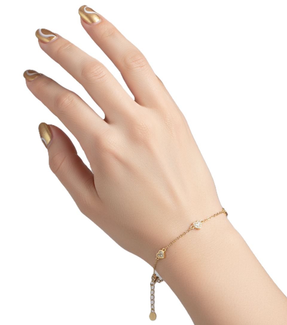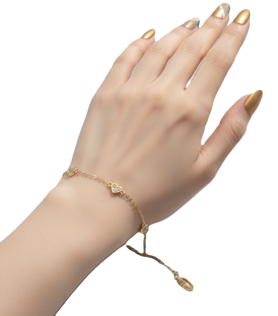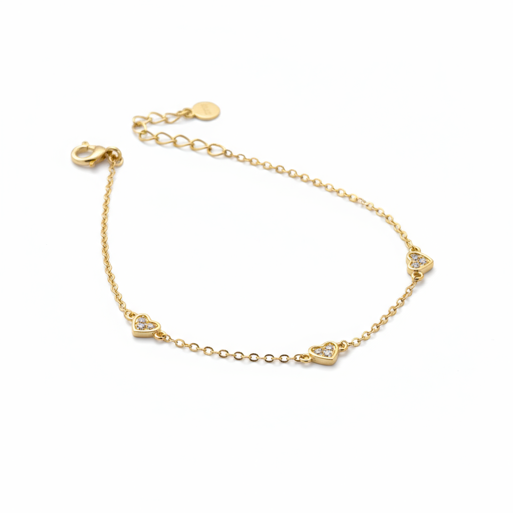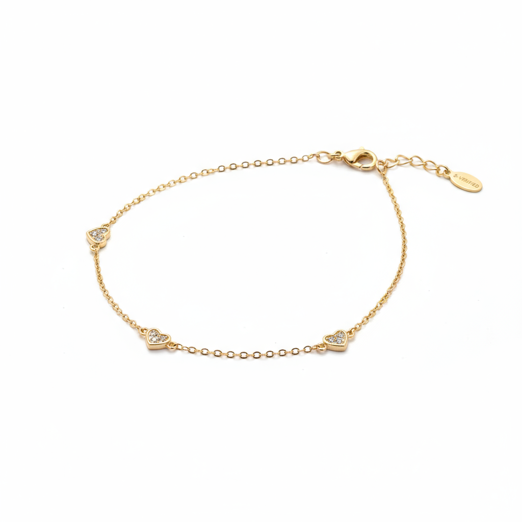 The bracelet features a delicate link chain, interspersed with three charming, petite heart-shaped stations. Each mini heart is meticulously set with sparkling micro-pave Cubic Zirconia stones, which catch the light beautifully. The design is simple, elegant, and perfect for the modern minimalist.