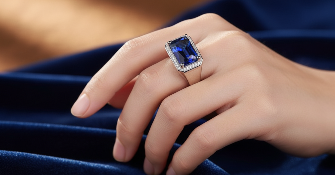 The centerpiece is a magnificent, rectangular-cut blue zircon stone, radiating a deep and mesmerizing azure hue that demands attention. This vibrant gem is brilliantly complemented by a halo of sparkling accent stones, adding a touch of luxurious glitter that enhances the zircon’s natural brilliance. The design is a harmonious blend of classic elegance and contemporary flair, making it incredibly versatile. Whether for a grand occasion or to elevate your daily attire, this ring promises “Unlimited Elegance” for the discerning individual.